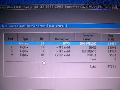 系統(tǒng)備份:從光盤啟動進入DOS環(huán)境,由于C、D、E分區(qū)都為NTFS格式在DOS下不能顯示,此時的C 盤就是當(dāng)初的FAT32格式的F盤了。運行其中的Ghost.exe,選擇Local----Partition----To Image(分區(qū)到鏡像文件的備份)。在GHOST里所有格式的分區(qū)都能看到,首先選擇需要備份的硬盤(如果有其他硬盤的話,加以選擇)。然后選擇需要備份的系統(tǒng)主分區(qū),在此我們選擇卷標(biāo)為 IBM_PRELOAD的1號分區(qū),如下圖: