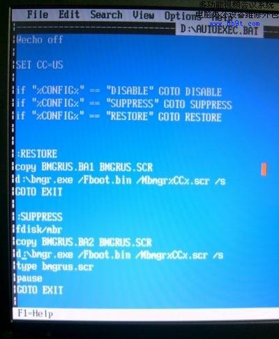 兩個(gè)文件創(chuàng)建完畢后,不要退出DOS,用edit編輯器打開D盤下的Autoexec.bat文件,大家注意了,此Autoexec.bat非我們剛才創(chuàng)建Autoexec.bat,它是由d2dfdzip.exe解壓縮而來(lái)的,它的用途就是在運(yùn)行時(shí)自動(dòng)執(zhí)行其中的指令,將相應(yīng)的代碼寫到硬盤的引導(dǎo)扇區(qū)中,這樣就將F11鍵和恢復(fù)系統(tǒng)關(guān)聯(lián)起來(lái)了。在沒有軟驅(qū)引導(dǎo)的情況下這個(gè)文件也不可能自動(dòng)運(yùn)行了。因此就得靠人為輸入來(lái)執(zhí)行,但是原來(lái)這個(gè)文件是按照在軟驅(qū)中運(yùn)行而編寫的,所以在路徑上稍作修改就行了。