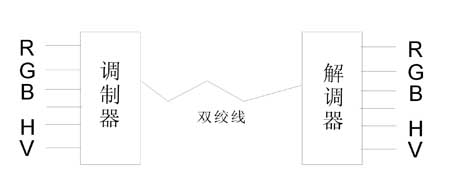 但是,有時候需要將VGA信號傳輸?shù)酱笥?0米的地方,則必須進行信號變換,將VGA調(diào)制到一個固定的頻率上發(fā)送出去,接收端收到信號后再解調(diào)出來,從中分離出紅、綠、藍三基色以及行、場同步信號,再傳輸給顯示器。具體流程如下圖: