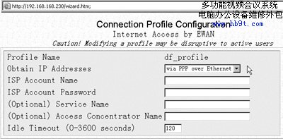 圖6 在Connection Profile Configuration頁面,我們可以選定寬帶網(wǎng)的類型,一般ADSL選擇via PPP over Ethernet,而Cable或者FTTB選擇via DHCP。如果ISP需要輸入用戶名和密碼,我們可以在下面的相應(yīng)位置輸入。