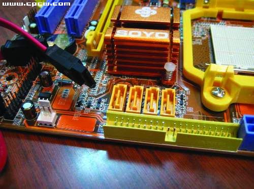 SATA接口較IDE接口速度更快,目前主流的SATA接口達(dá)到了300MB/s的速度,是IDE接口速度一倍多SATA接口呈L型,我們連接時(shí)只要把數(shù)據(jù)線和主板上的接口按照形狀對(duì)準(zhǔn)就可以了(圖5)